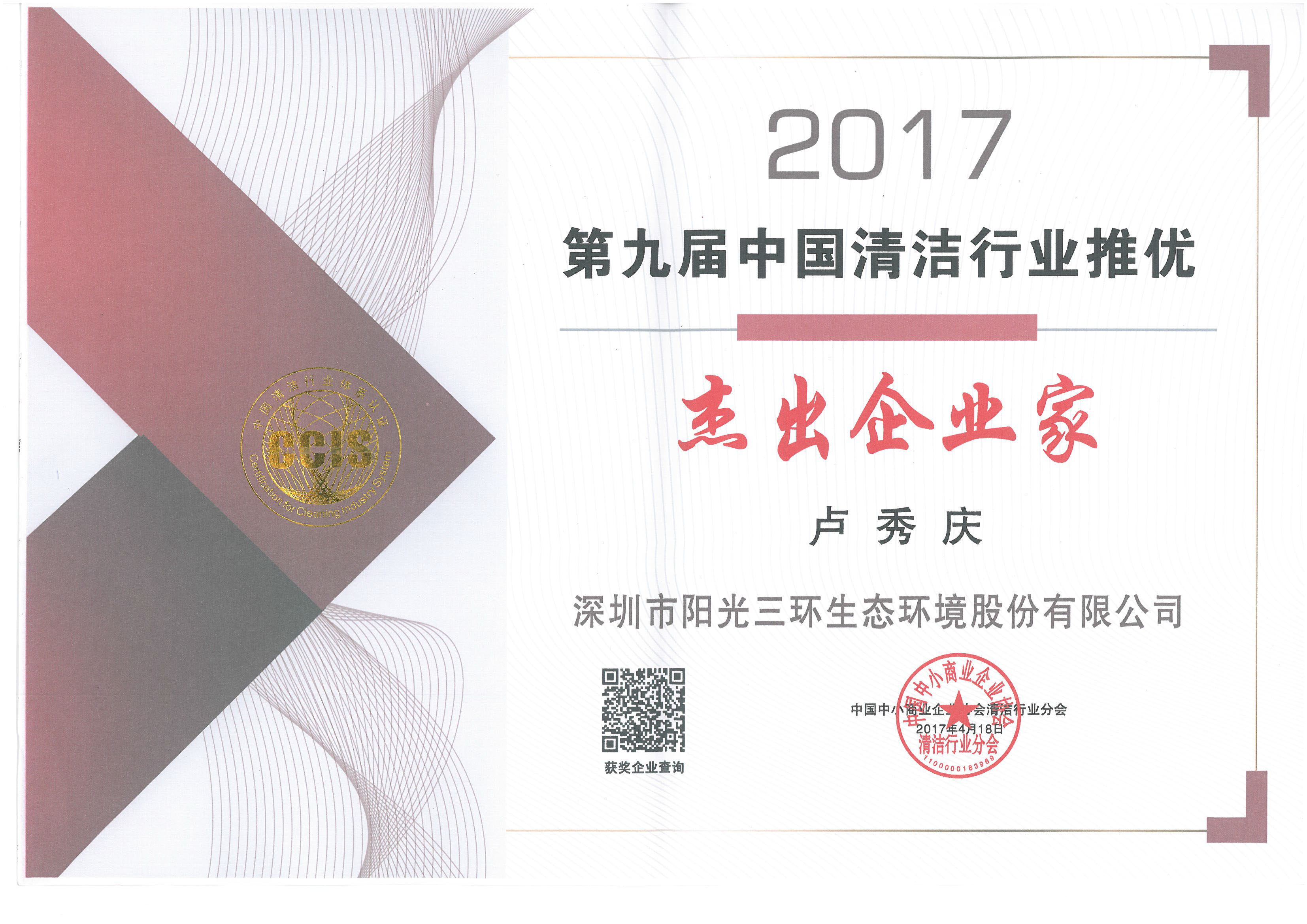 作者:陽光三環 日期:2017-04-21 陽光三環成功榮獲“十佳清潔服務企業”,董事長盧秀慶先生被授予“杰出企業家”榮譽稱號... -