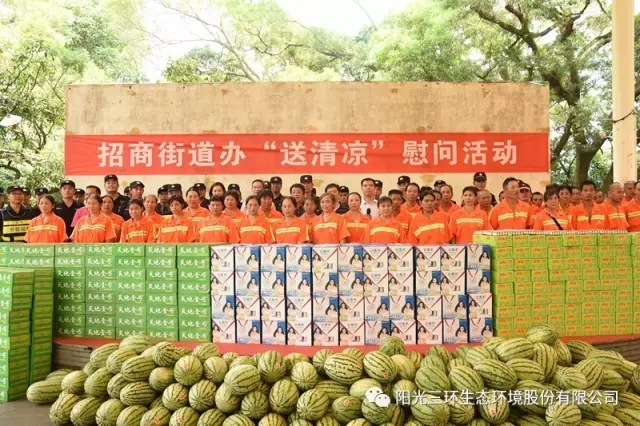 8月22日,招商街道辦朱副書(shū)記、黃輝大隊(duì)長(zhǎng)親自帶隊(duì),慰問(wèn)轄區(qū)300余名環(huán)衛(wèi)工人、100余名協(xié)管員,發(fā)放王老吉、天地一號(hào)涼茶、牛奶、西瓜、風(fēng)油精防暑降溫五件套,為奮戰(zhàn)在一線的員工帶去一份“清涼”的問(wèn)候。公司總裁盧秀慶、常務(wù)副總裁和慧、副總裁陳照宣參與此次活動(dòng)。