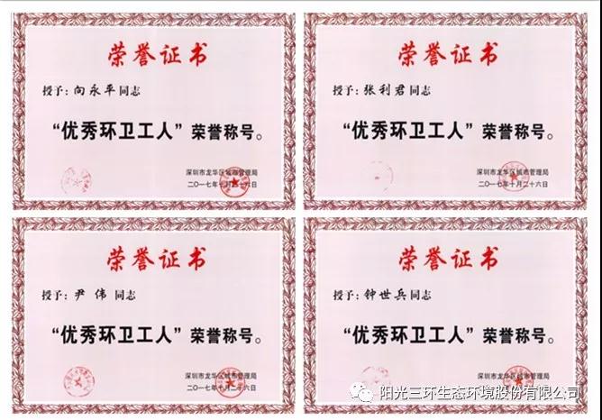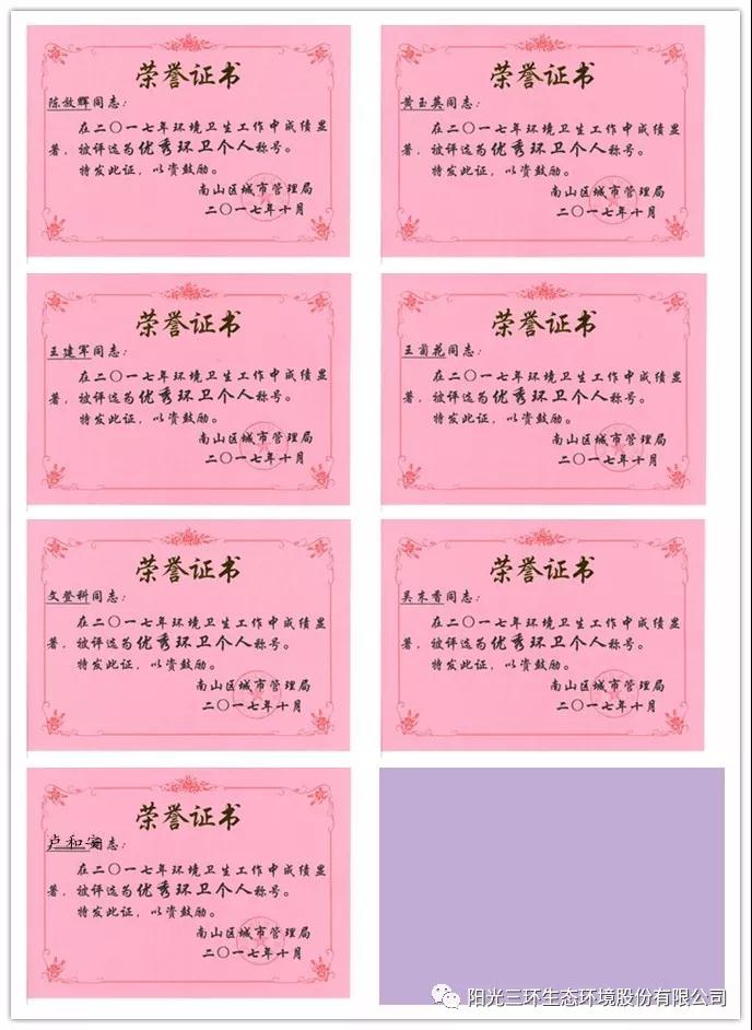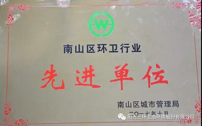 公司榮獲“2017年度南山區(qū)環(huán)衛(wèi)行業(yè)先進(jìn)單位”稱號,蛇口項目部盧和安、陳放輝等7名員工榮獲“2017年度南山區(qū)優(yōu)秀環(huán)衛(wèi)工人”稱號。