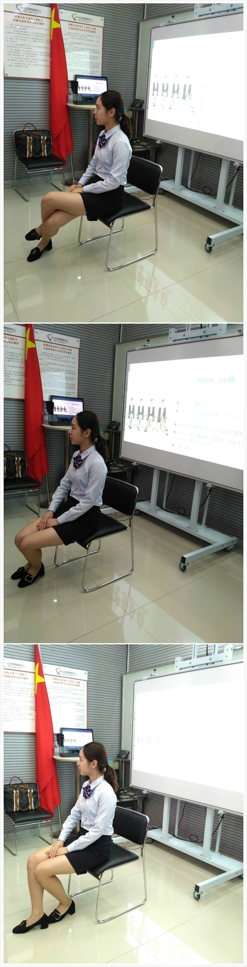 商務(wù)禮儀中的坐姿展示,雙腿疊放式、雙腳交叉式、雙腿斜放式,以正確的禮儀坐姿表示對對方的敬意和尊重。